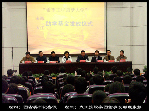 2007年12月4日下午,“希望工程圓夢(mèng)大學(xué)”大江助學(xué)基金在浙江工業(yè)大學(xué)隆重舉行,團(tuán)省委書(shū)記魯俊、浙江工業(yè)大學(xué)黨委副書(shū)記韓翼祥、浙江青基會(huì)執(zhí)行理事長(zhǎng)兼秘書(shū)長(zhǎng)李迪以及學(xué)校團(tuán)委負(fù)責(zé)人等到會(huì)祝賀,大江控股集團(tuán)董事長(zhǎng)助理張靜出席了基金的首發(fā)儀式并講話(huà)。